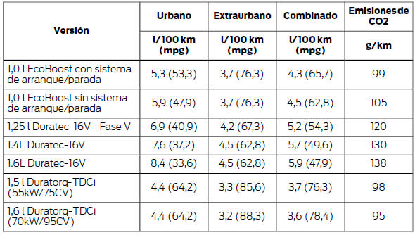 Ford Fiesta / Ford Fiesta Manual del Propietario / Combustible y repostaje / Especificaciones técnicas